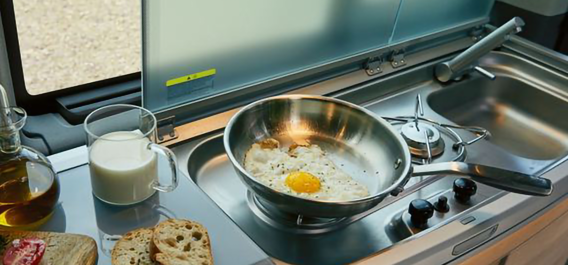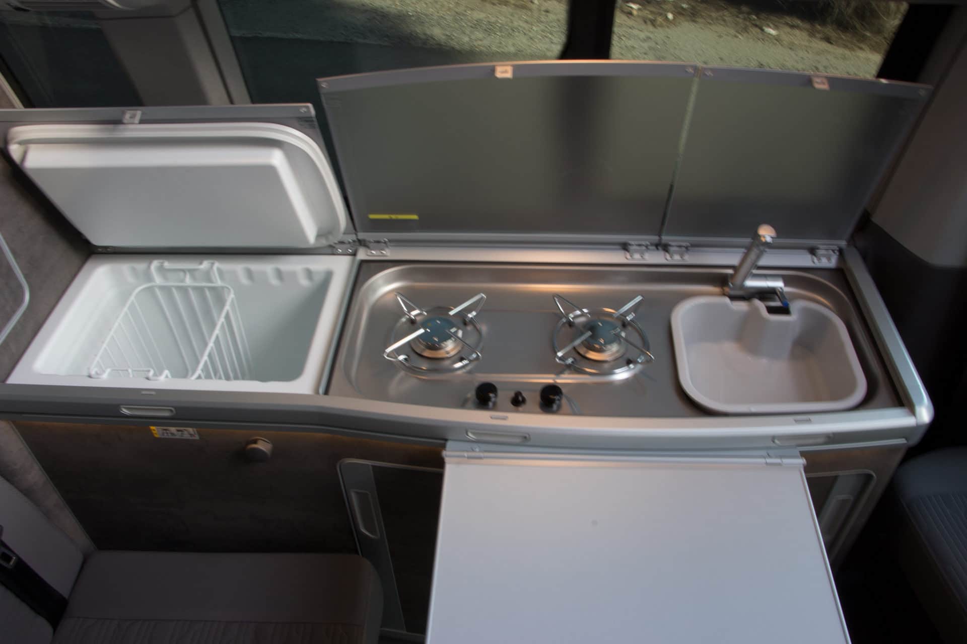 The Ocean is fully equipped with a pop-up roof and upper bed, a complete kitchen (fridge, sink and stove) and a flexible living and sleeping area. A great extra is the integrated outdoor shower, ideal after the beach, hiking or sports activities.